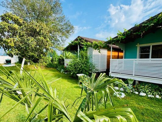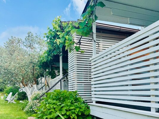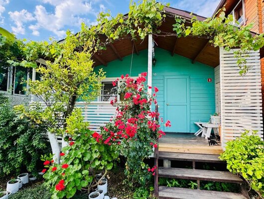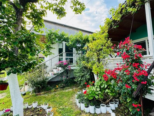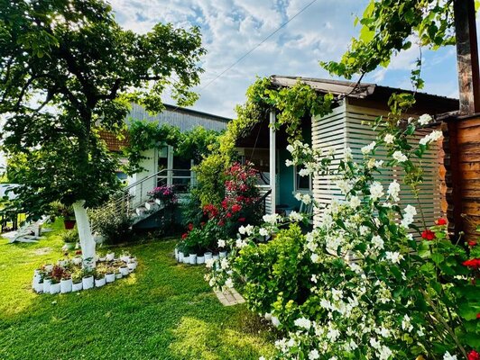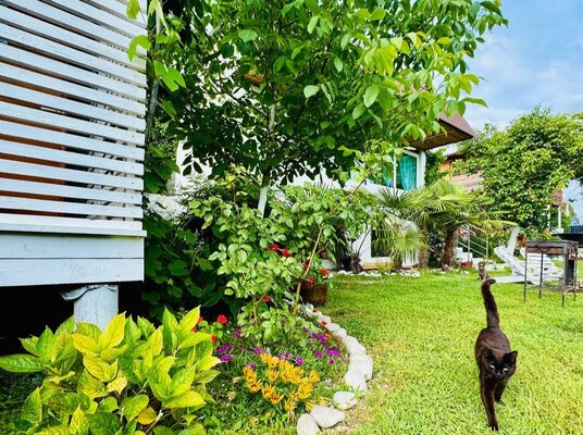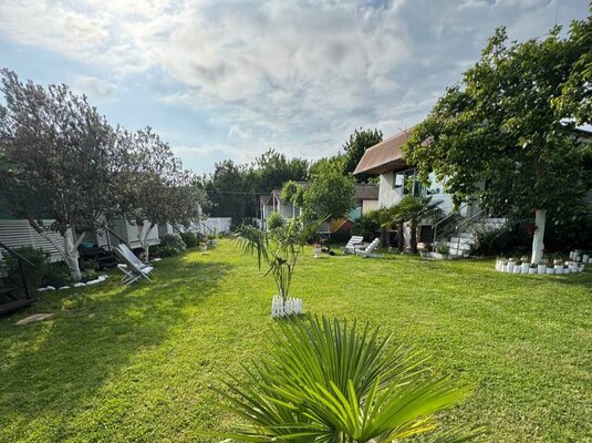 - Просторный зеленый двор, идеальный для отдыха, с мангалом, барной зоной, шезлонгами и креслами-мешками.