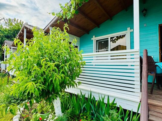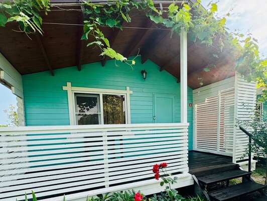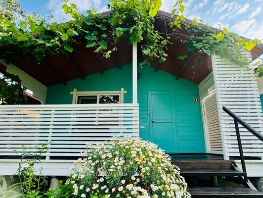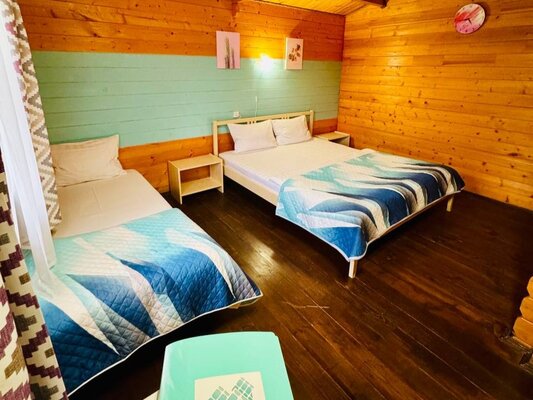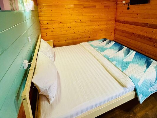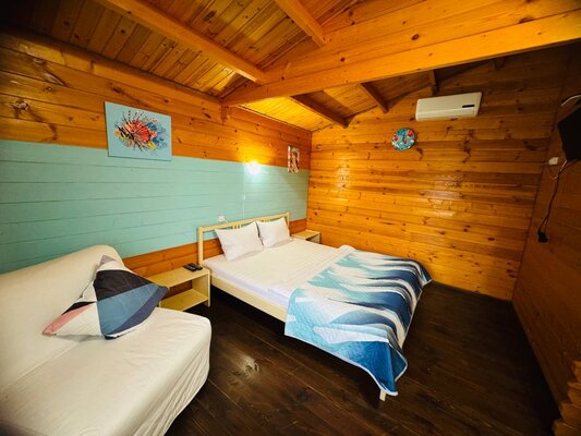 Для размещения база отдыха предлагает просторный и комфортабельный коттедж, рассчитанный на 4 человек. Его интерьер выполнен в светлых, спокойных тонах с использованием натуральной деревянной мебели, создавая атмосферу уюта и релакса. В коттедже к вашим услугам двуспальная и односпальная кровати, а также удобное кресло-кровать, вместительный шкаф, прикроватные тумбочки, стол со стульями и сушилка для одежды. Каждый коттедж оборудован собственной террасой, Wi-Fi, сплит-системой, спутниковым ТВ, холодильником, а также индивидуальным душем и санузлом.