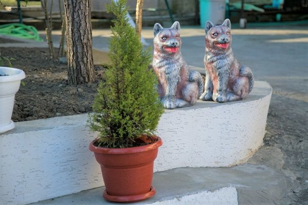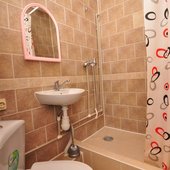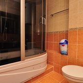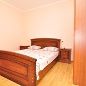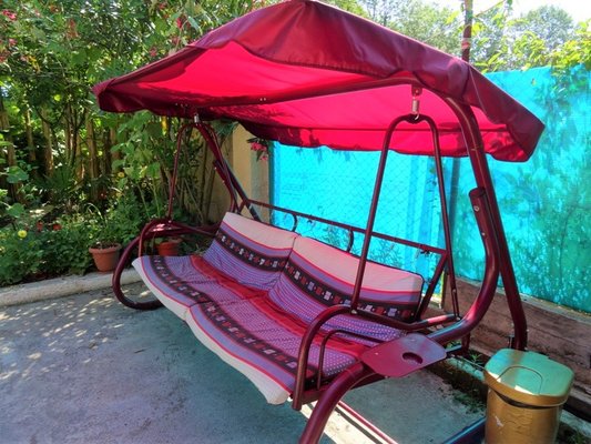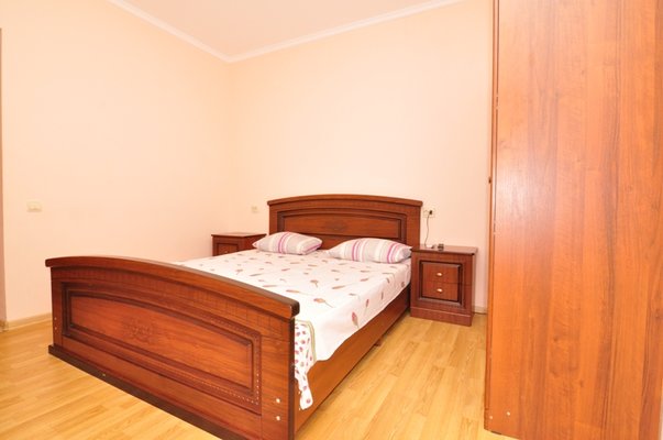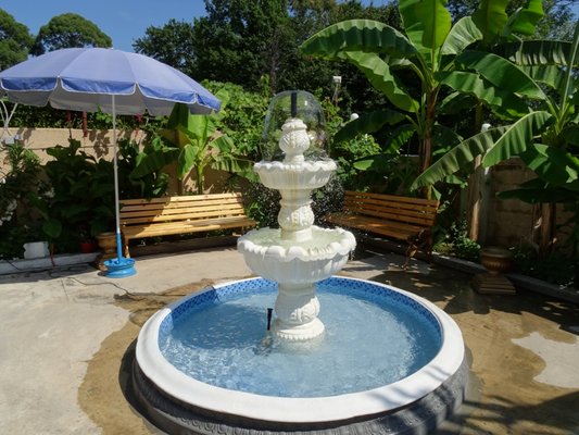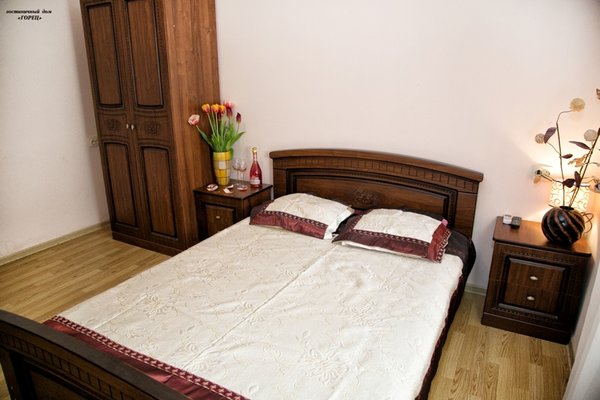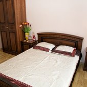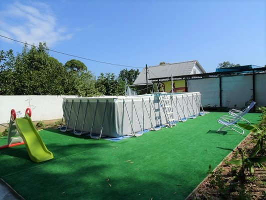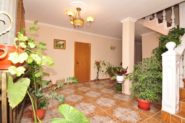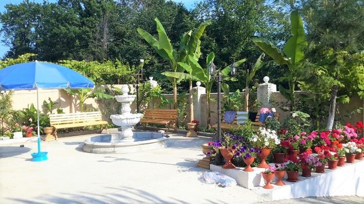 Находится трехэтажный гостевой дом на закрытой территории с парковкой на несколько мест для машин. Двор, утопающий в зелени и цветах, украшает фонтан. На большом участке, принадлежащем гостевому дому, установлен большой бассейн, мангал, устроена зона барбекю и места для отдыха. В гостевом доме одновременно могут располагаться до 58 отдыхающих, которым предлагаются номера категории «полулюкс». В каждом из них есть удобная мебель, зеркала, широкие кровати, сплит-система, телевизоры. Персонал гостевого дома поддерживает идеальную чистоту и в комнатах, и в санузлах с душем.