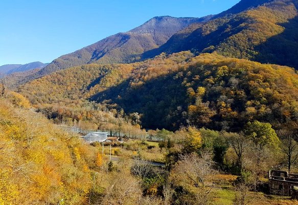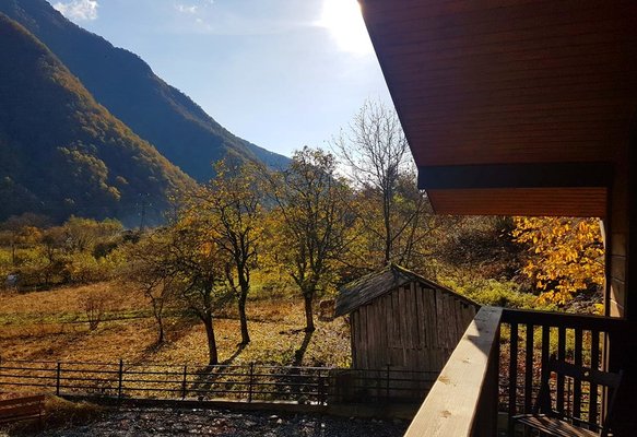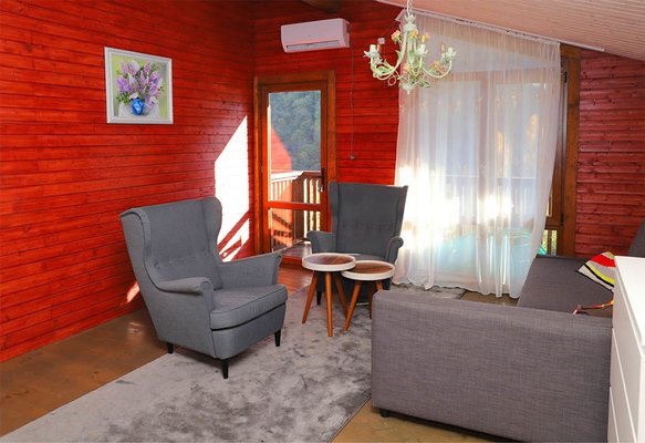 Отельный комплекс, расположенный среди живописной природы, состоит из двухэтажных коттеджей, которые рассчитаны на размещение от двух до двенадцати человек. Домики выстроены с применением экологически чистых материалов, в каждом номере имеется санузел с душем, кондиционер, телевизор и холодильник. С балконов открываются живописные виды на горы, реку Бзыбь и ущелье.