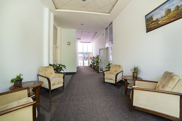 На первом этаже гостиницы находится ресторан. В ресторане красивый стильный зал с панорамными окнами.