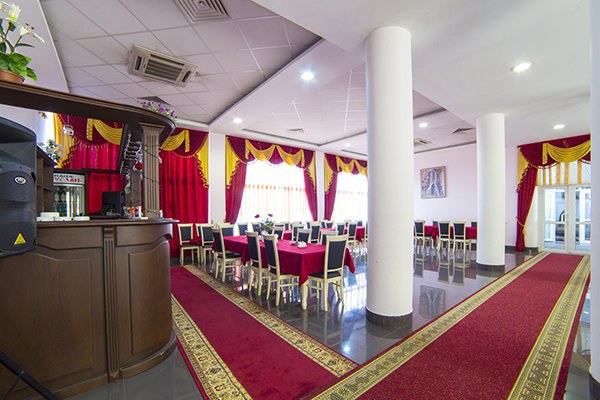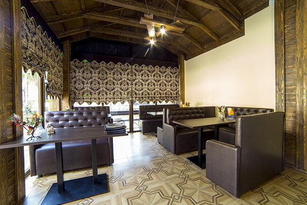 В ресторане на первом этаже готовят блюда европейской и кавказской кухни. Столы накрываются в просторном зале с панорамными окнами.