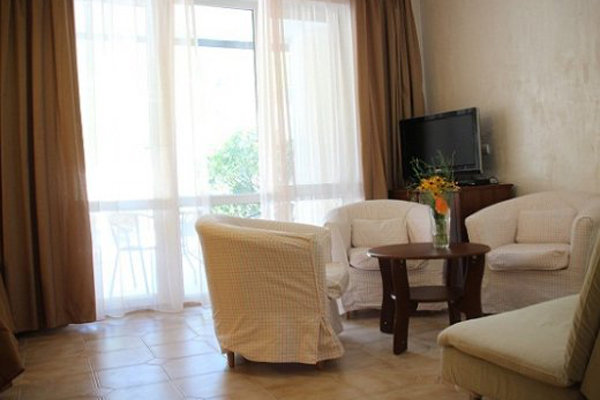 Собственная территория гостевого дома огорожена и благоустроена. Здесь, в тени высоких эвкалиптов, стоит трехэтажный жилой корпус в итальянском стиле. В его жилом фонде — 14 просторных номеров категорий «люкс» и «стандарт» с балконами или террасами. Все гостиничные номера оборудованы отдельными санузлами с душем и необходимым набором бытовой техники.