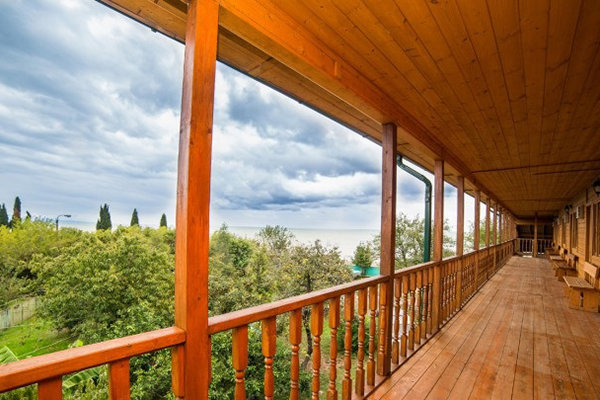 С просторных балконов в деревянном оформлении открывается впечатляющий вид на море и зелень.