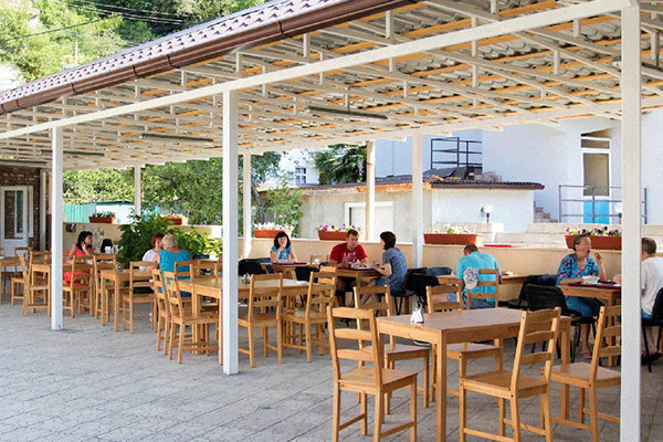 Питание зависит от сезона: в высокий сезон гостям подают завтраки, обеды и ужины, а с октября по декабрь кафе закрыто.