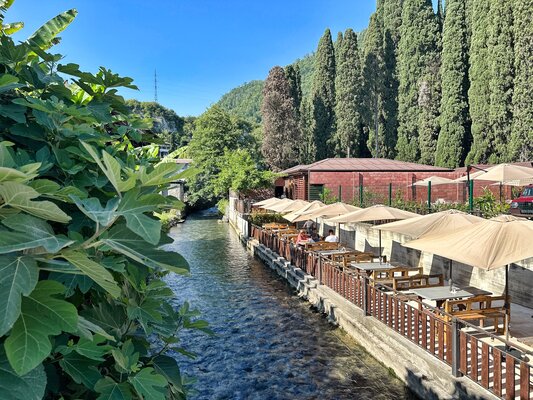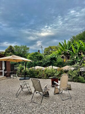 Насладитесь отдыхом у реки, расположившись за столиком под зонтиком.