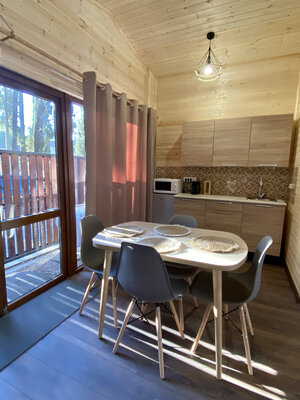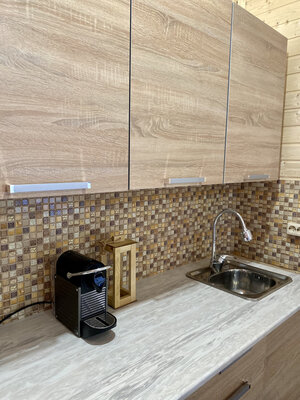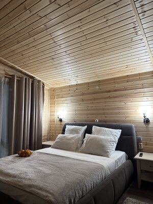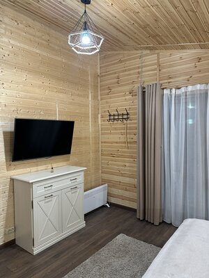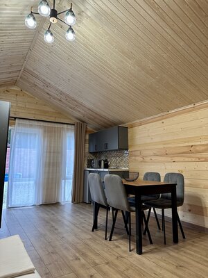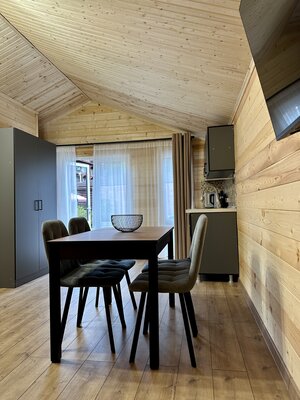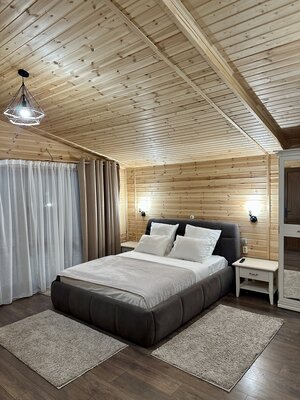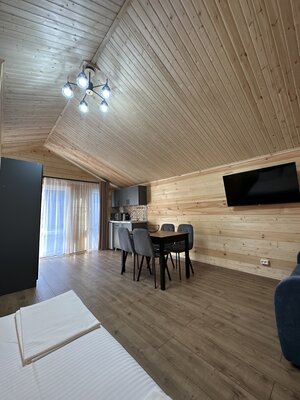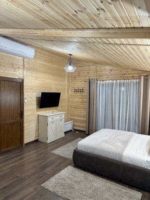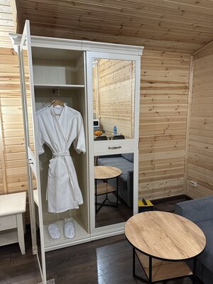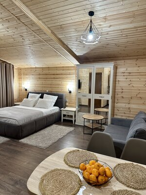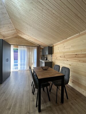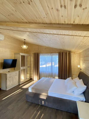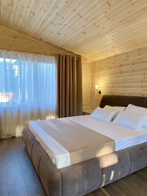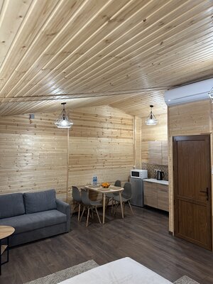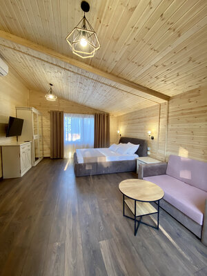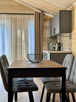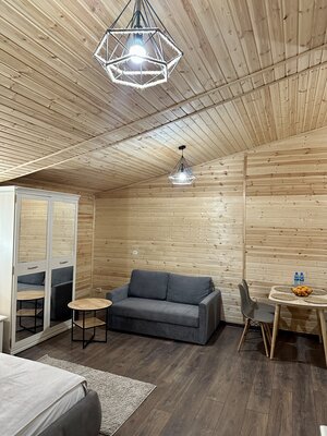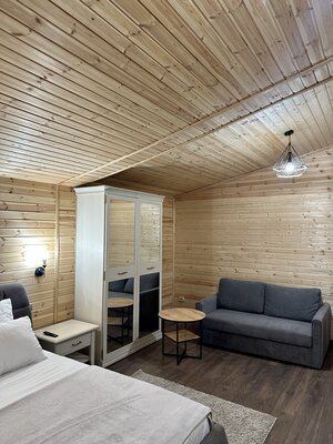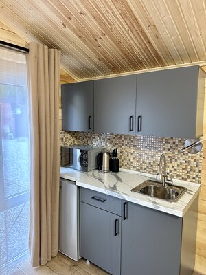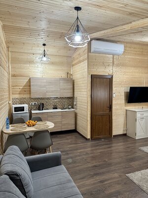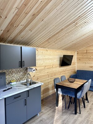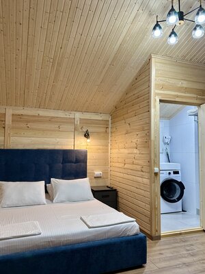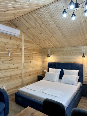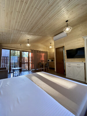 Каждый домик обустроен для комфортного отдыха: здесь вас ждут просторная двуспальная кровать, большой раскладной диван, стиральная машина, компактная кухонная зона, фен и набор принадлежностей для чая и кофе. По предварительному запросу может быть предоставлена кофемашина.