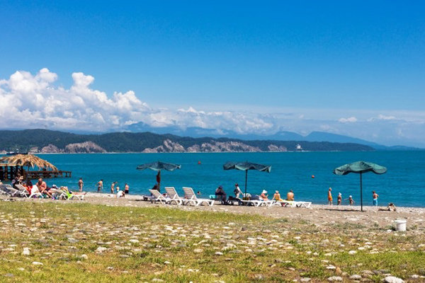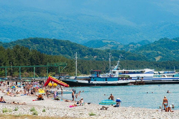 Поездом или самолетом – до г. Адлер, далее на общественном транспорте или на такси до Казачьего рынка (8 км от ж/д вокзала, 15 км от аэропорта), затем пройти пешком около 500 метров до пограничного поста на р. Псоу до границы России и Абхазии. После самостоятельного прохождения паспортного и таможенного контроля до места отдыха можно доехать на автобусе, маршрутном такси или воспользоваться услугами частных водителей.