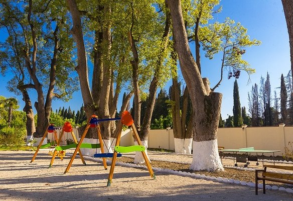 Пятиэтажное здание пансионата «Ривьеры» окружено южными растениями — кипарисами, соснами, самшитом, магнолией, деревьями фейхоа. В округе много виноградных плантаций. По соседству нет шумных ресторанов и клубов, поэтому «Ривьера» идеально подходит для уединенного отдыха, семейного отпуска с детьми. На закрытой территории пансионата «Ривьера» много аллей и фонтанов, приятных уголков для отдыха.