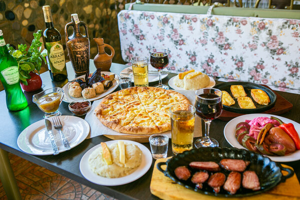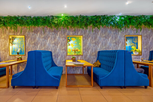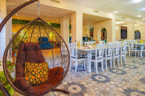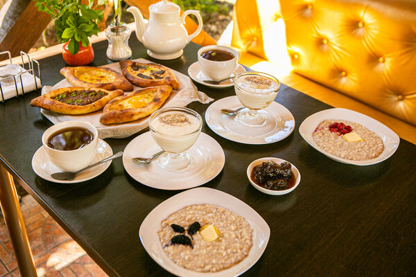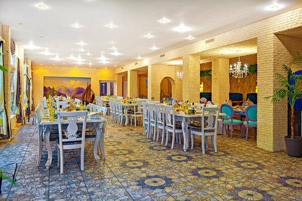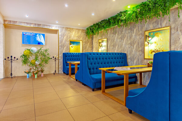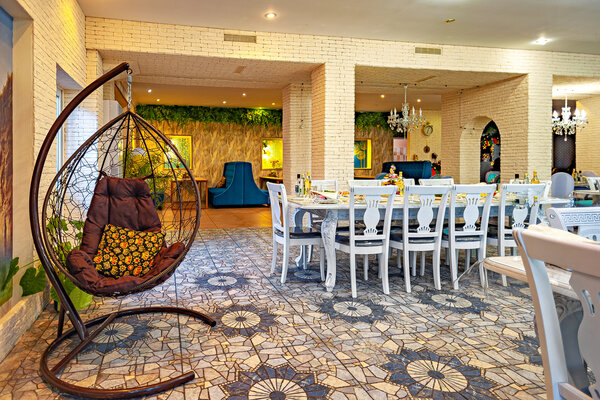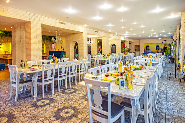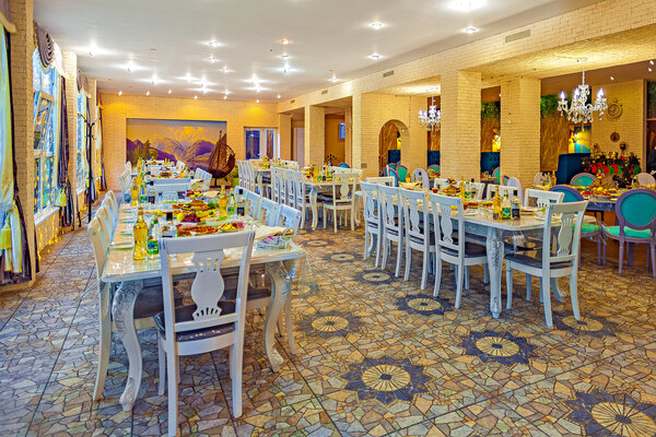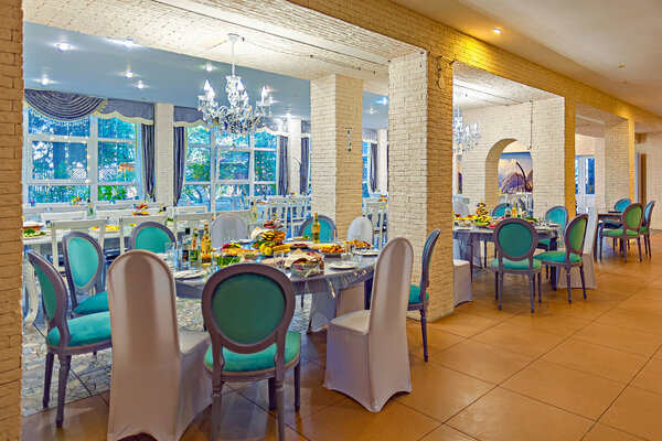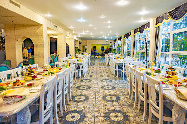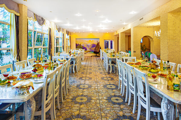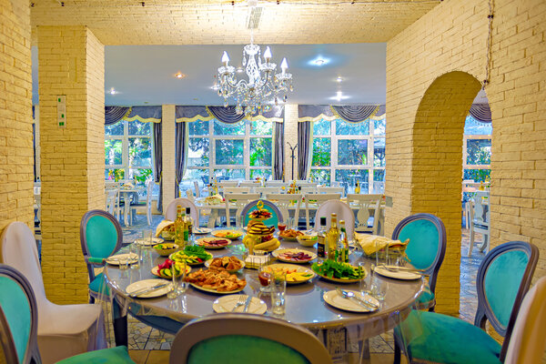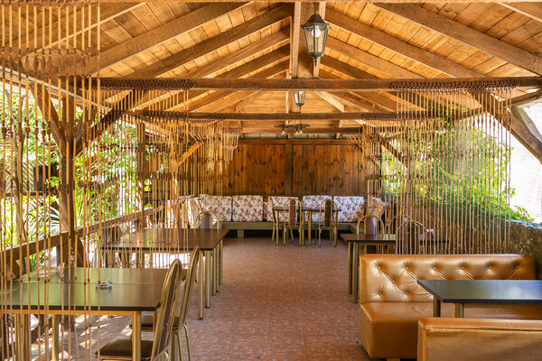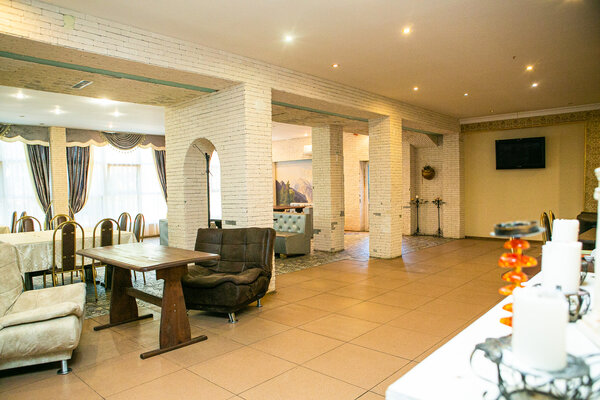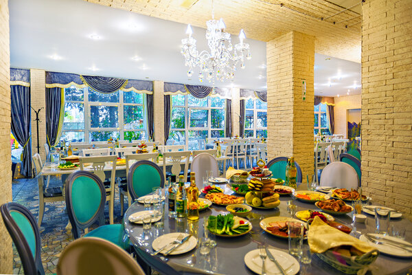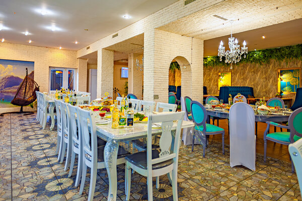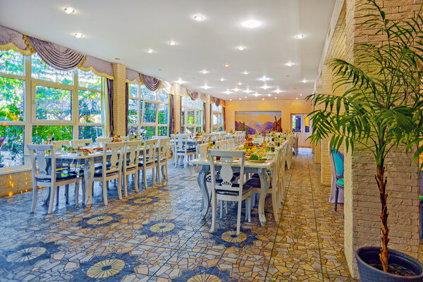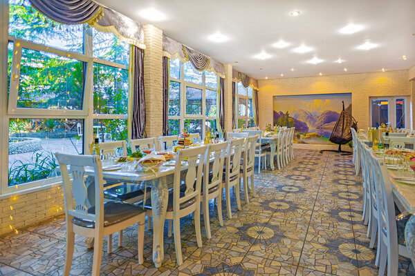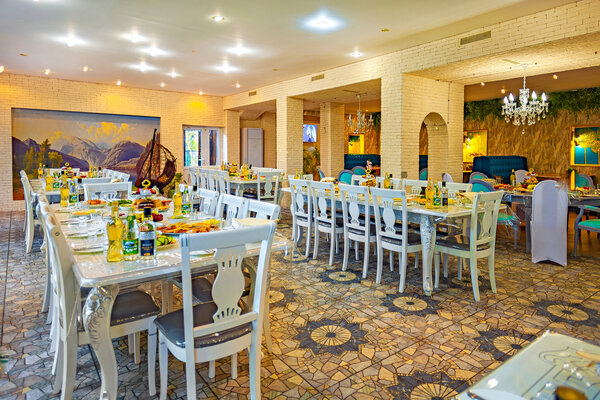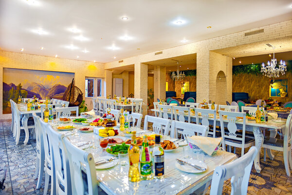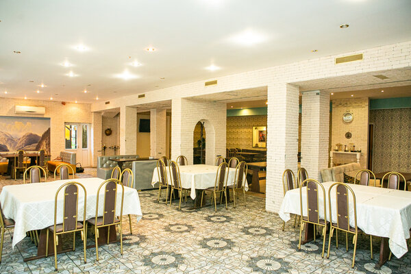 На территории отеля есть ресторан на первом этаже с банкетным залом на 150 посадочных мест, где вы можете насладиться полноценным питанием, включенным в проживание. В меню включены традиционные блюда европейской и кавказской кухни. В а-ля-карт меню представлены элементы европейской, итальянской и абхазской кухни.