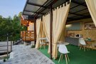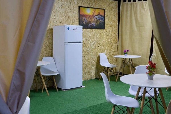На территории расположена общая кухня, где можно готовить еду самостоятельно. Кухня оснащена всем необходимым: плитой, посудой, микроволновой печью, столами и стульями.