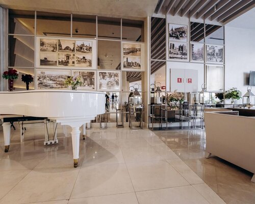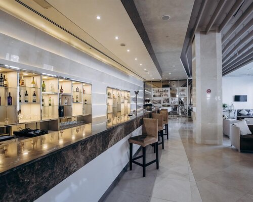 Ресторан «Риф» на 18 этаже отеля предлагает блюда национальной и европейской кухни по меню с прекрасным видом на море. Бар «Чемпион» расположен на 17 этаже и предлагает панорамный вид на Приморский бульвар. В баре гости могут насладиться местными и импортными напитками.