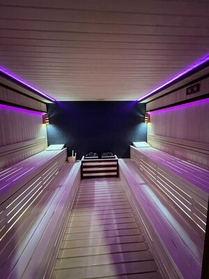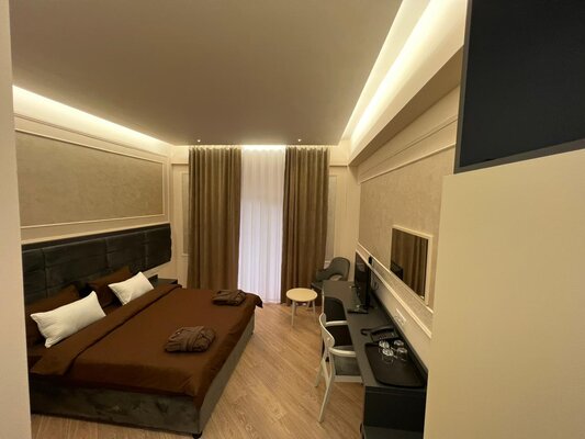 Во дворе отеля также есть зеленый парк, бассейн, бар у бассейна, детская площадка, беседки, а также развлечения в виде диджеев, живой музыки и шоу. В санатории имеется 96 номеров разной категории с удобствами.