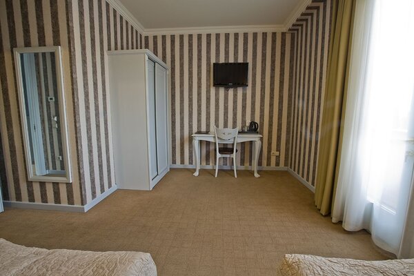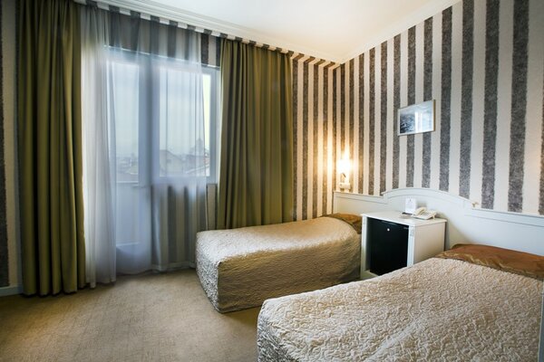 Поездом до ж/д вокзала г. Анапа, далее пройти 300 м до остановки общественного транспорта и на автобусе №333 двигаться до останови «Площадь Европы», далее 380 м пройти до отеля.