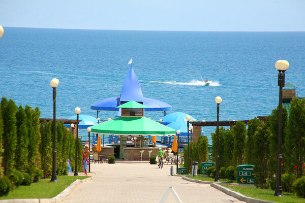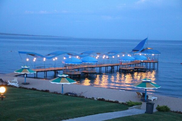 Собственный песчаный пляж на берегу озера с шезлонгами, зонтами и беседками.