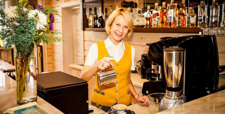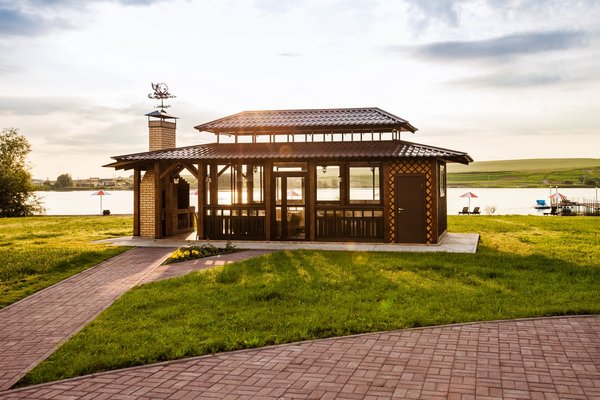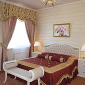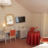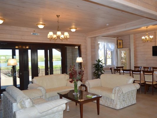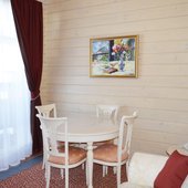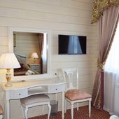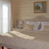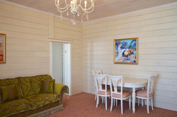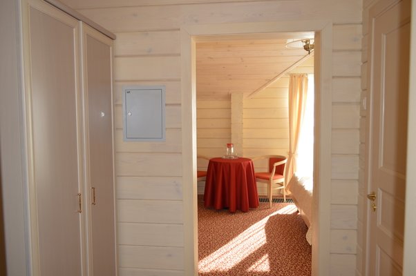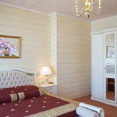 Отель, окруженный благоустроенным парком с сетью дорожек, качелями и беседками, с широкой террасой, примыкающей к озеру, и собственной вертолетной площадкой, построен из древесины сосны. Роскошный, тщательно продуманный интерьер сделает ваш семейный отдых комфортным, уютным и беззаботным.