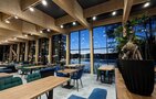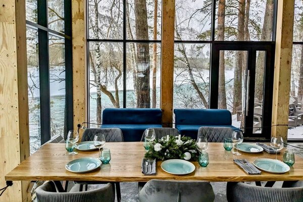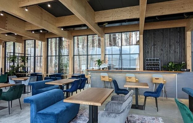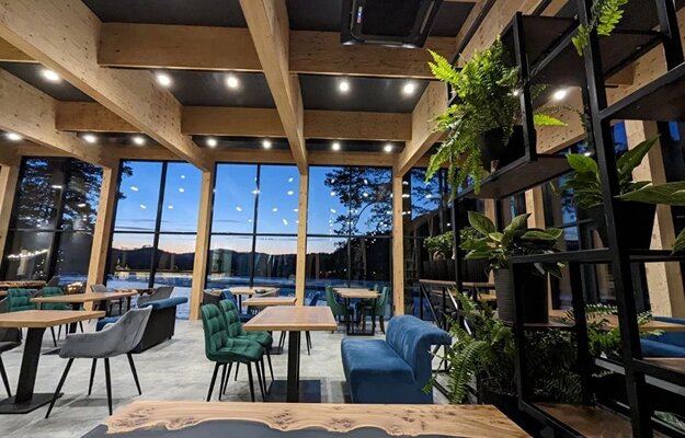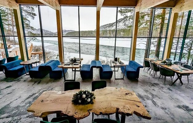 Новый просторный рестробар – на 80 посадочных мест. Стильный – интерьер в природных оттенках. С окнами от пола до потолка с видами на Катунь.