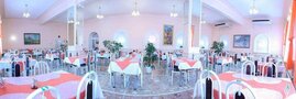 На выбор посетителей предлагаются 3-4 блюда из каждого раздела меню. Питание сбалансировано по содержанию белков, жиров, углеводов и калорийности и подбирается в зависимости от категории отдыхающих. Меню постоянно обновляется путем введения новых и фирменных блюд. Картотека блюд насчитывает более 1200 наименований.