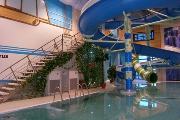 - двумя бассейнами (детский и большой). Площадь большого бассейна — 200 кв.м. Температура воды в детском бассейне 32°С, в большом 30°С. Непрерывно осуществляется очистка (без хлора), обеззараживание и добавление свежей водопроводной воды. При этом используются специальные реагенты, система фильтров и ультрафиолетовое излучение;