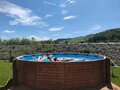 Сезонный бассейн на берегу реки в окружении гор, газонов и цветников.