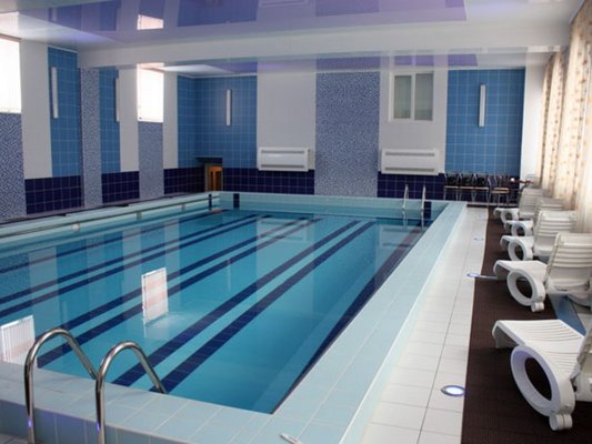 Вокруг бассейна – зона отдыха с шезлонгами для каждого гостя. Объем воды 160 м. куб, глубина до 1,5 метра, постоянный подогрев.