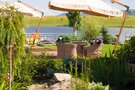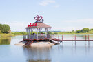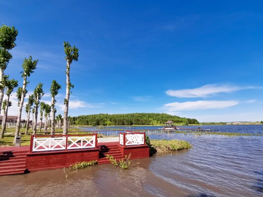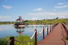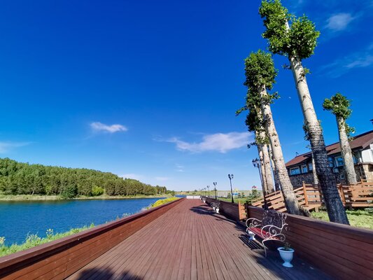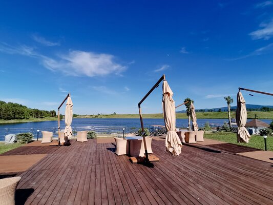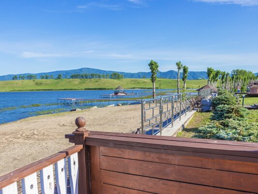 У озера оборудована пляжная зону с шезлонгами и зонтами, чтобы гости могли с комфортом загорать и купаться.