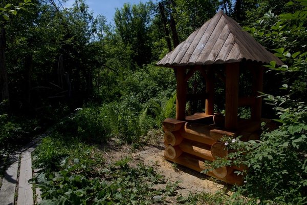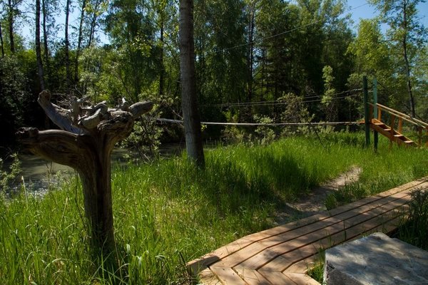 Во вторых, природа на острове совершенно не изменена человеком, а, наоборот, жилища и другие постройки гармонично вписаны в естественный природный ландшафт. Дорожки на острове сделаны по примеру тротуаров древних алтайских деревень. Это настил из досок сибирской лиственницы (на которой стоит Венеция), позволяющий комфортно и без ущерба для природы передвигаться по «Хутору Кедровому».