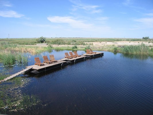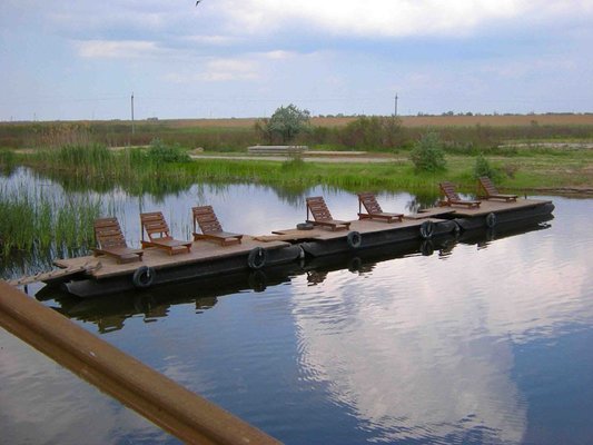 Для удобного спуска в воду установлен понтон, на котором есть лежаки. Тут гости купаются, загорают, и наслаждаются нежным дуновением ветра.