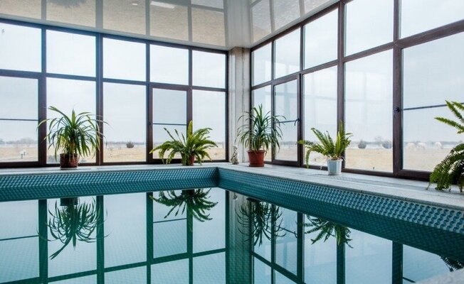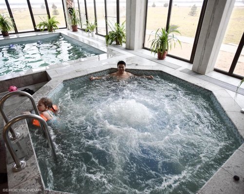 Рядом с бассейном расположена гидромассажная ванна диаметром 3 метра.