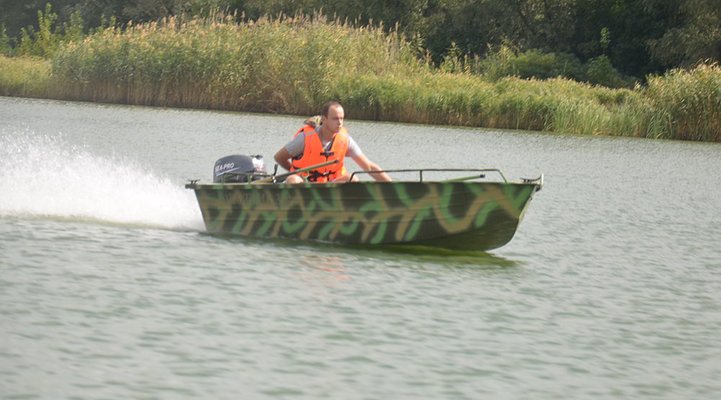 Мотор: 2-х тактный. Мощность: 5 л/с (права ГИМС не требуются). Вместимость: до 2-х рыбаков. Лодка ПВХ 420 с румпельным управлением. Оборудована креслами и держателями удилищ.