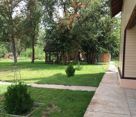 Территория представляет собой огороженный забором участок площадью 2000 м2, берег пологий песчаный в 100 метрах от дома. Территория благоустроенна, засажена фруктовыми деревьями, цветами, посеян газон.