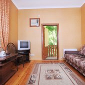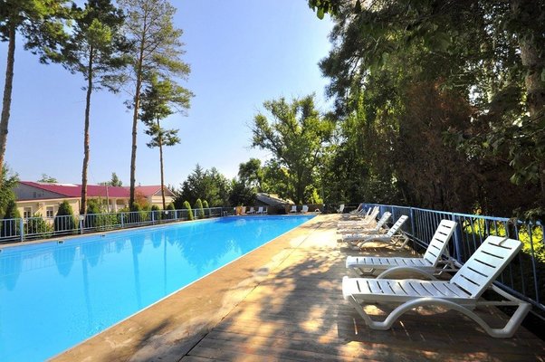 Буйство зелени. Домики прячутся в листве. Деревянное зодчество. Открытый бассейн и банкетный зал с верандой.