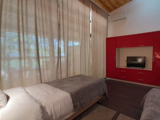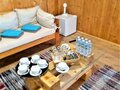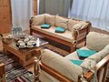 Гостиная оснащена всем необходимым для комфортного отдыха: холодильник, чайник, телевизор.
