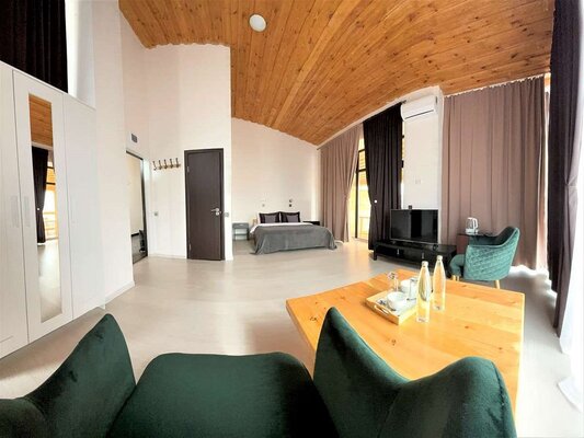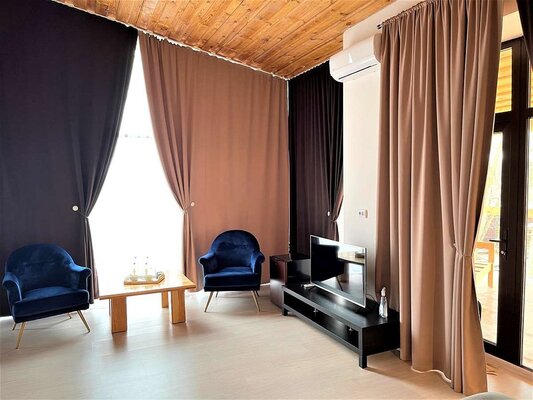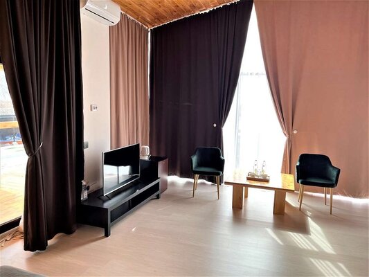 Отдохните после бани в уютной гостиной с панорамными окнами и мягкой мебелью.