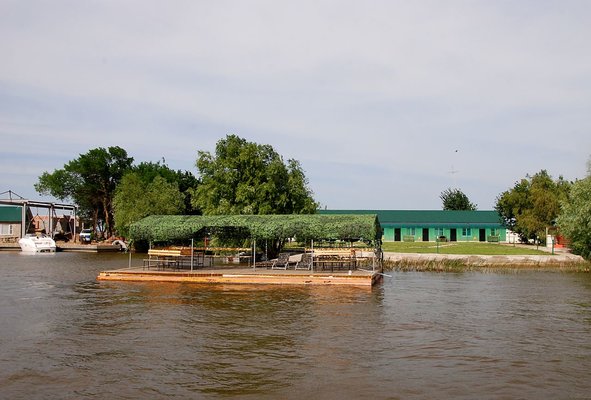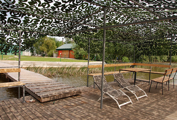 А для отдыха, рыбалки и купания на базе имеются крытые плавучие понтоны, оборудованные столами, скамейками и шезлонгами, для любителей позагорать