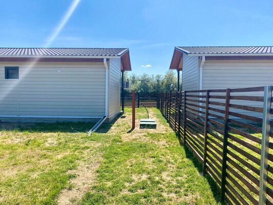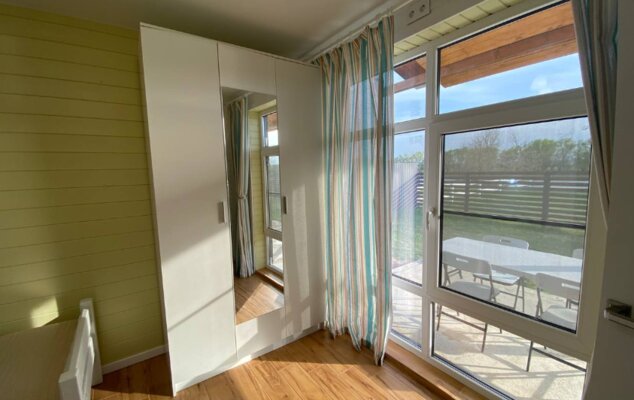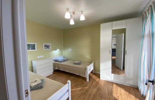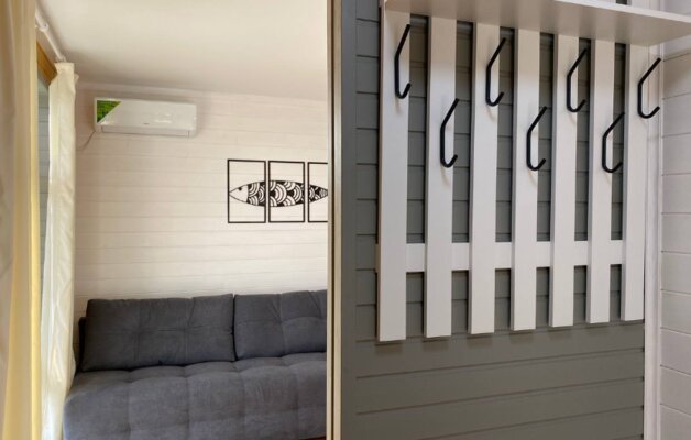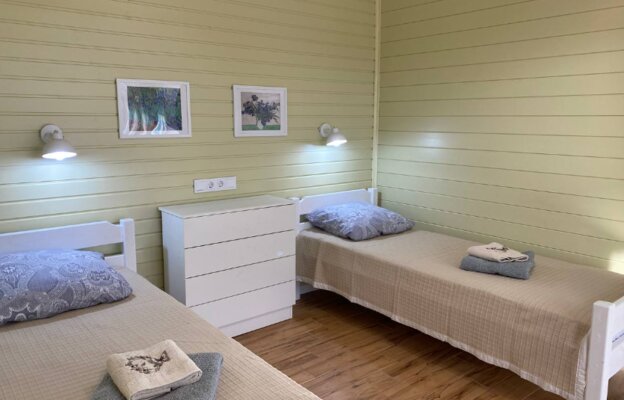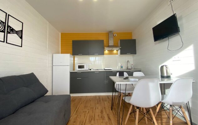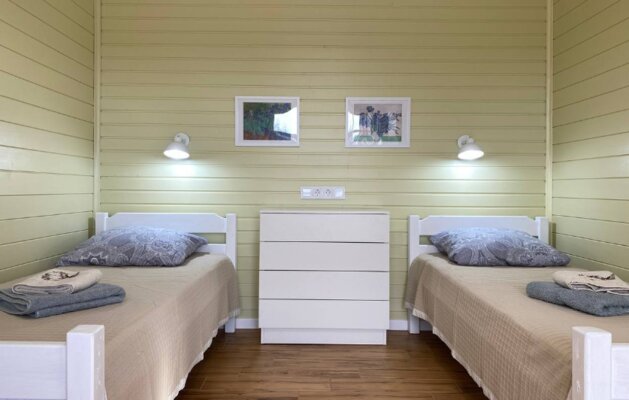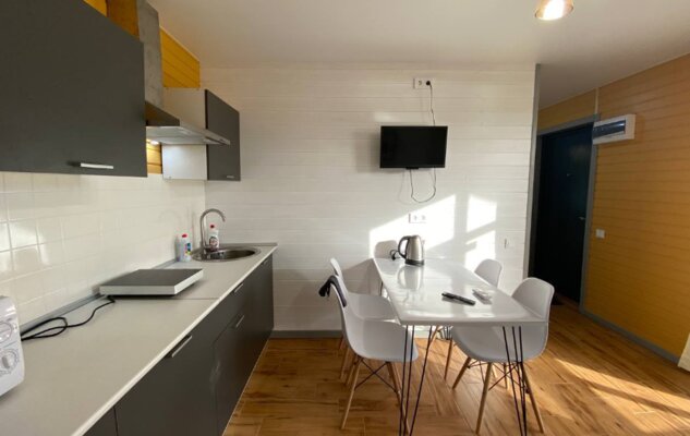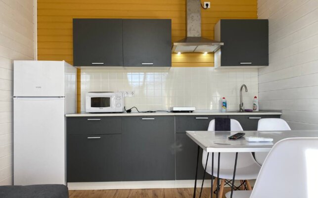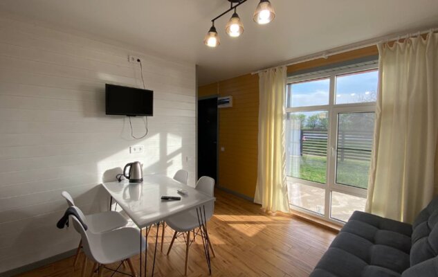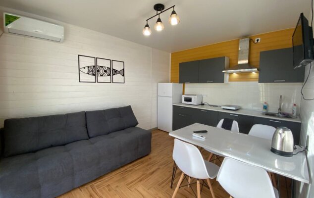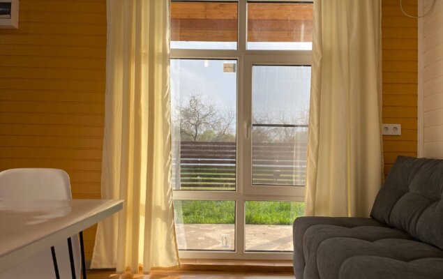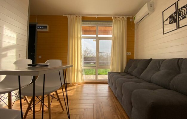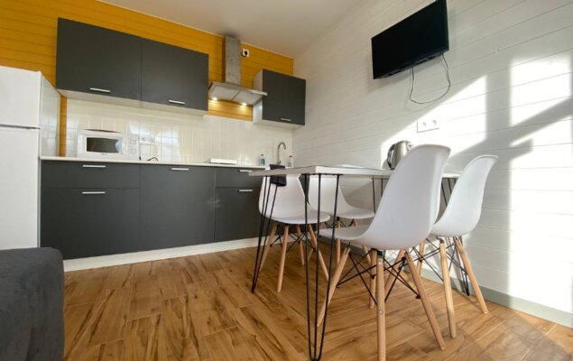 Интерьер домиков тщательно продуман и оформлен с любовью к деталям. Современная кухня-гостиная оснащена всем необходимым для самостоятельного приготовления еды, включая бытовую технику. В санузле с душевой кабиной установлен бойлер на 100 литров. Удобные спальни располагают ортопедическими матрасами. Гостям предоставляется новое постельное белье из натурального хлопка, подушки из пуха гусей и по два полотенца на человека. Для дополнительного удобства в кухне-гостиной имеется большой раскладной диван.