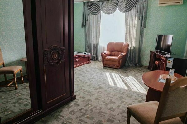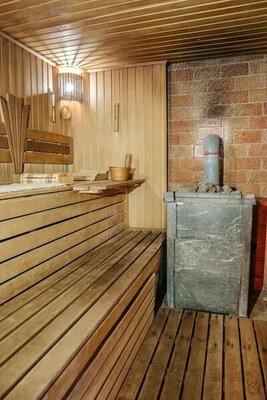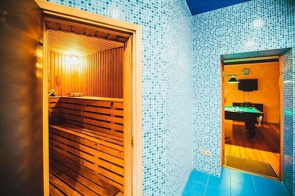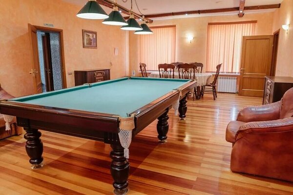 Баня рассчитана на 12 человек. Оборудованы уютная комната отдыха и бильярдный зал.