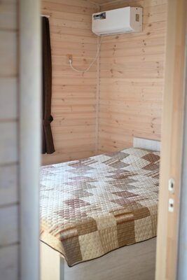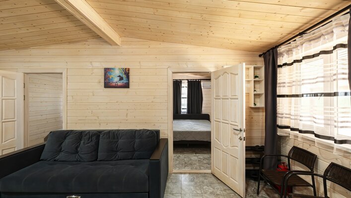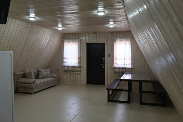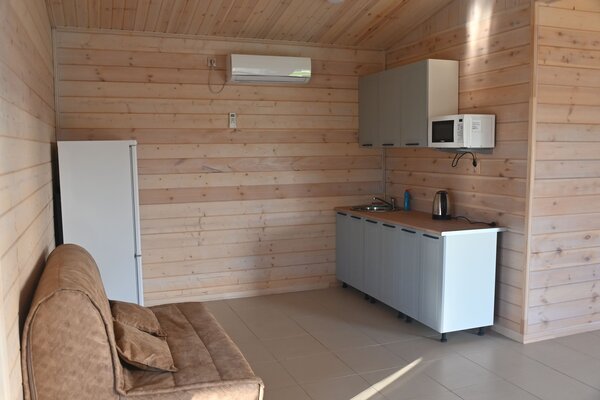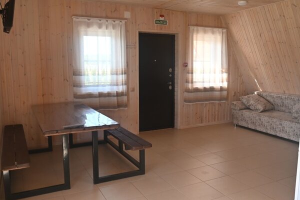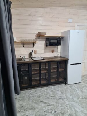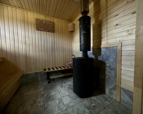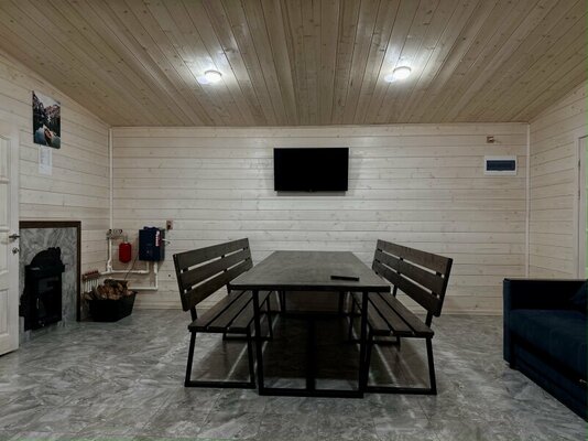 Баня на дровах с уютной террасой, идеально подходящая для расслабляющего отдыха. Внутри расположена просторная парная с печью, зона отдыха, оборудованная сплит-системой для комфортного микроклимата, а также холодильник, посуда и доступ к цифровому телевидению и бесплатному Wi-Fi.