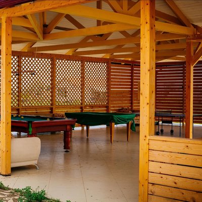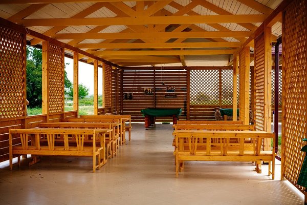 Для корпоративного отдыха рядом с бассейном расположена банкетная беседка до 50 человек с холодильником, мангальной зоной и прочими удобствами.