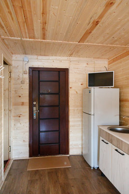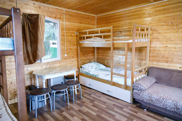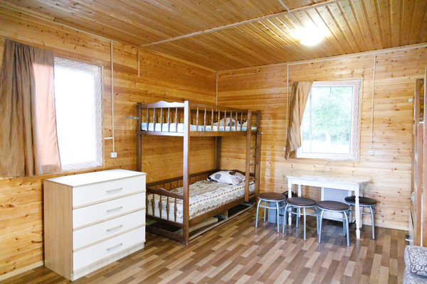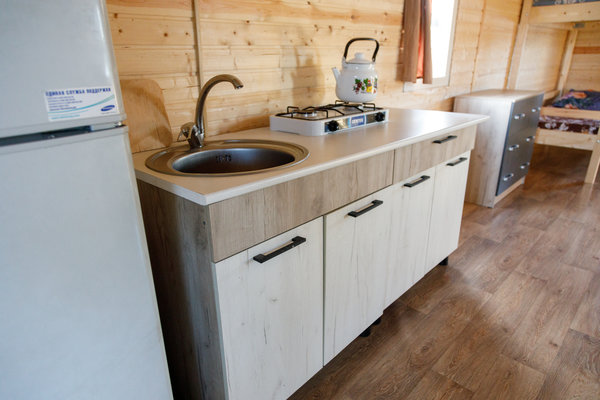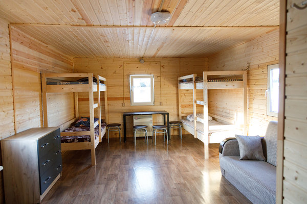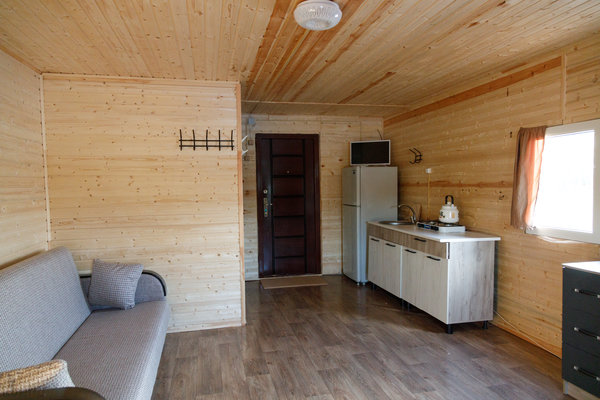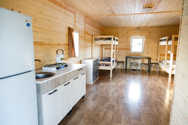 Домики полностью оснащены для проживания. Вас ожидает общая комната отдыха, кухня, душевая кабина с горячей и холодной водой, а также туалет.