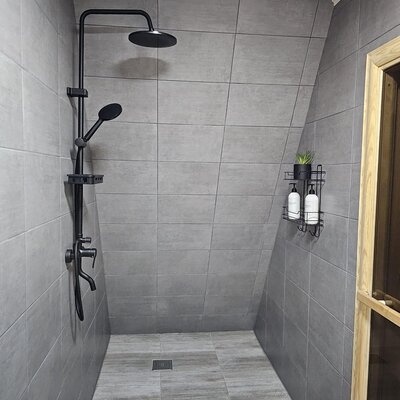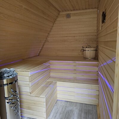 В сауне установлена электрическая печь с эффектом «Русской бани», поэтому можно подливать воду в квадратный испаритель, расположенный в центре каменки. Также можно добавлять ароматические масла, которые стоят на полочке в душевом помещении.
