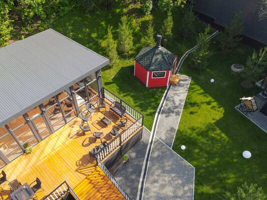 На территории отеля также работает банкетный зал вместимостью до 30 человек, идеальный для проведения мероприятий. Расслабиться можно в русской бане с электропечью, просторной комнатой отдыха и банным чаном на террасе.