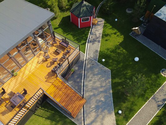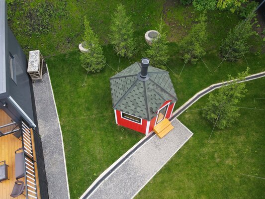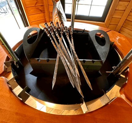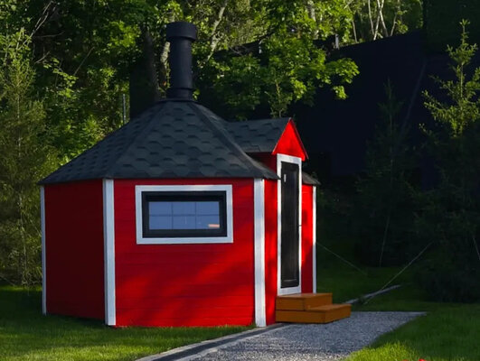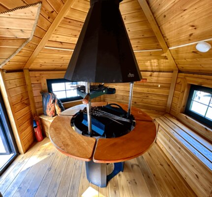Внутри — удобные скамейки, столы и главное — очаг, вокруг которого так приятно собраться компанией. Здесь всегда тепло, вкусно пахнет дымком и царит особая, почти сказочная атмосфера. Готовьте мясо, овощи или рыбу, не думая о погоде — гриль-домик защищён от ветра, дождя и снега. Комфортно в любое время года, хоть летом, хоть в морозный вечер.