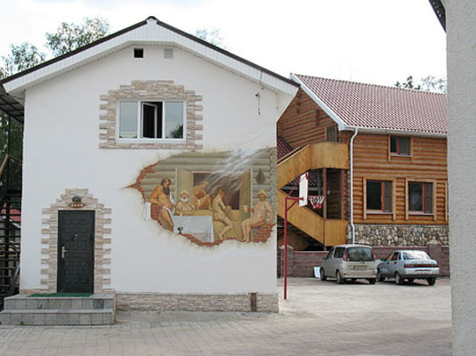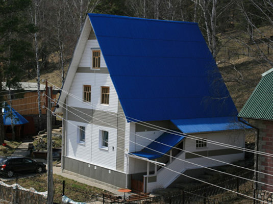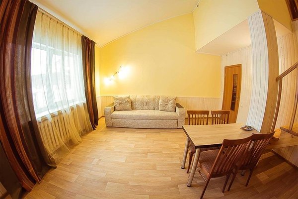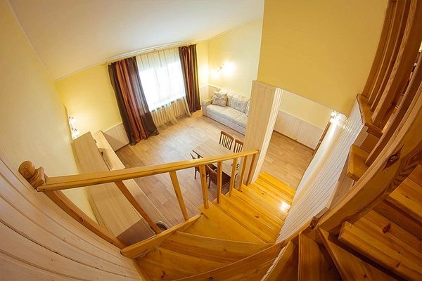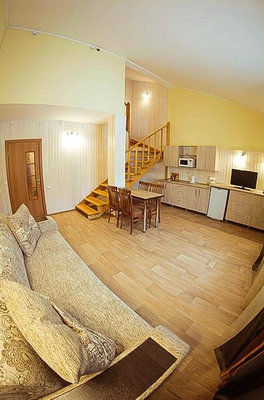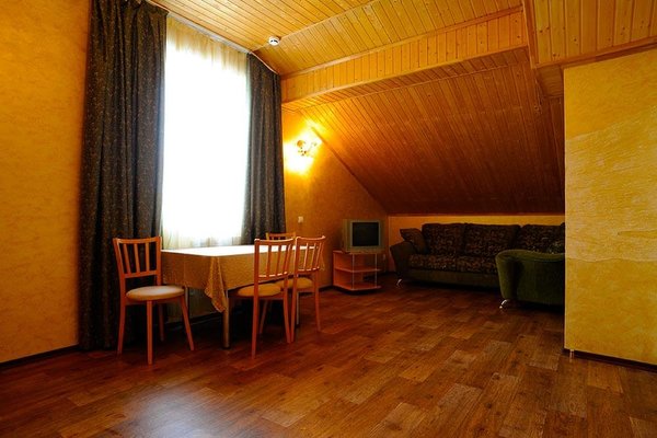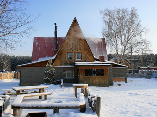 А так же на третьем этаже находиться конференц-зал на 40 человек. Для гостей предоставляется три корпуса на 23 номера, три дома для больших компаний, кафе, две бани и сауну с бассейном, площадку для пикника, детскую площадку, охраняемую автостоянку.