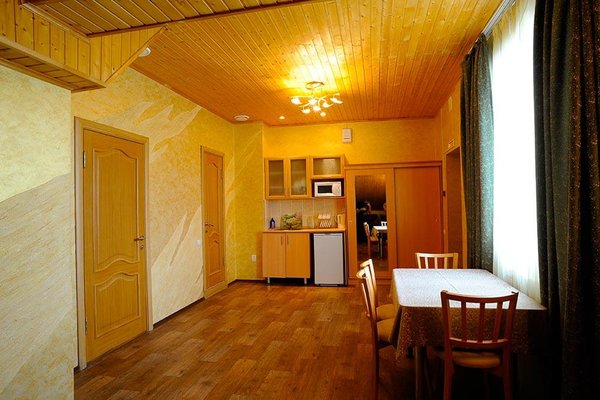 В отеле «Эдельвейс» гостей ждет уникальный банный комплекс, в который входят хамам, удобный бассейн и традиционная баня, способные разместить до десяти человек — идеальный выбор для дружной компании или семьи. В уютной комнате отдыха оборудована кухонная зона с большим столом и комфортной мебелью, где можно расслабиться после релаксации.