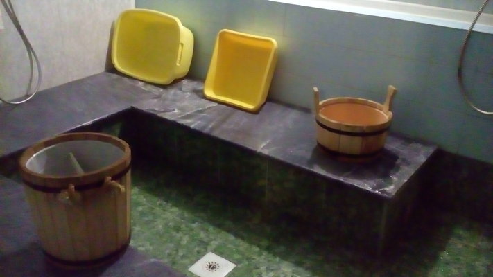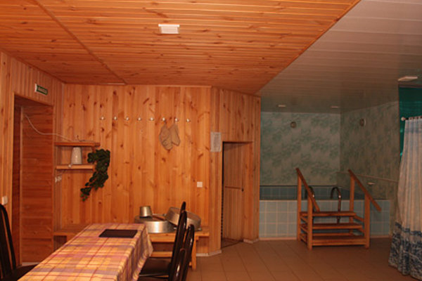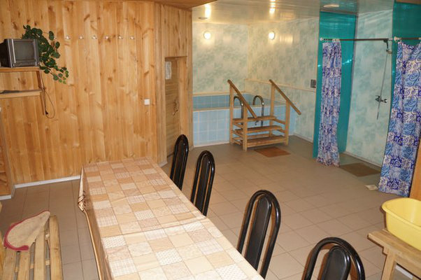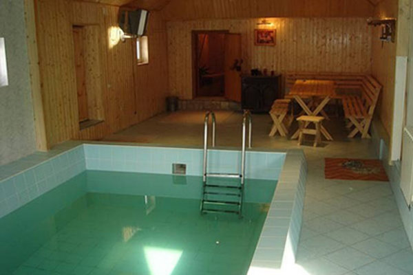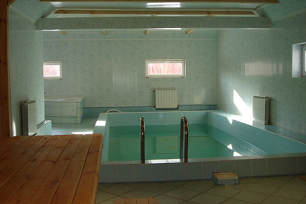 баня русская — на дровах с бассейном 3х6 и малым бассейном для детей до 8 человек. Отделана мраморными плитами. Оснащена ТВ, столом, стульями, санузлом.