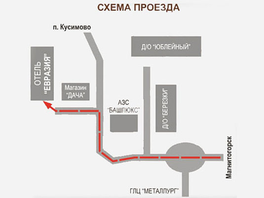 Гостиница «Евразия» находится в 2 мин. езды от ГЛЦ «Металлург-Магнитогорск», поворот с дороги между большим зеленыммагазином “Ситно" и столовой "Тарелка" - прямо 100 метров.