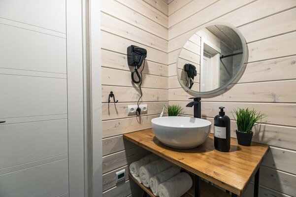 В коттедже вас ждет уютная обстановка с новой мебелью, собственной ванной комнатой, телевизором и оборудованной кухонной зоной с всей необходимой бытовой техникой для приготовления еды.