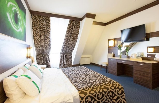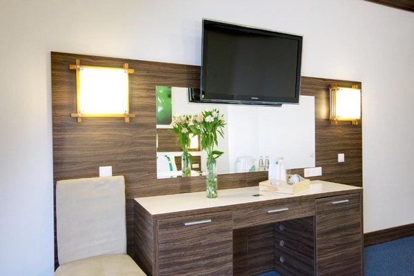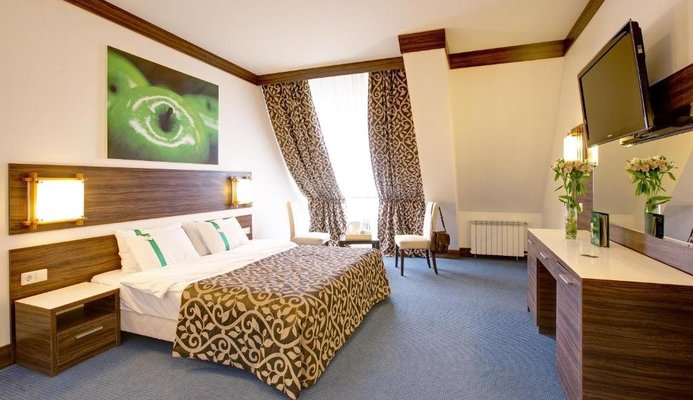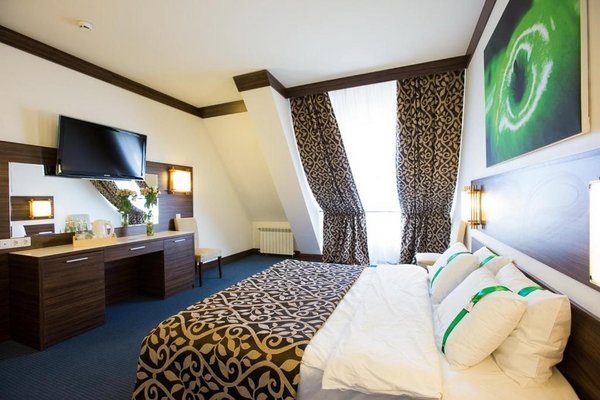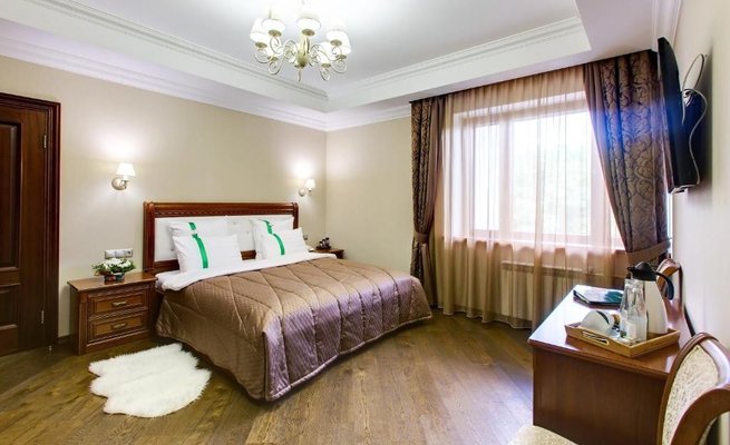 Многоэтажное здание отеля, отличающееся оригинальной архитектурой, расположено на возвышенности. Благодаря этому из окон всех комфортабельных номеров открываются захватывающие виды на панораму рек и живописные лесные массивы. Общий жилой фонд способен разместить до 300 гостей. Каждый номер оснащен всем необходимым для комфортного пребывания: кондиционером, плазменным телевизором, мини-холодильником, а также ванной комнатой с душем или ванной. Для удобства постояльцев предусмотрены тапочки, халаты и косметические принадлежности.