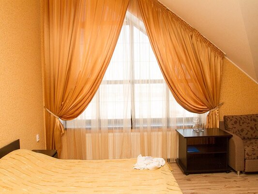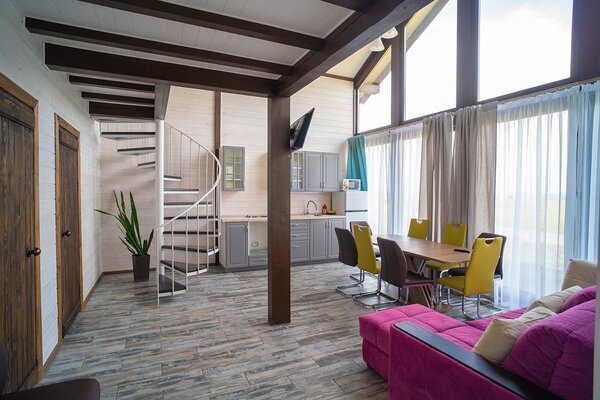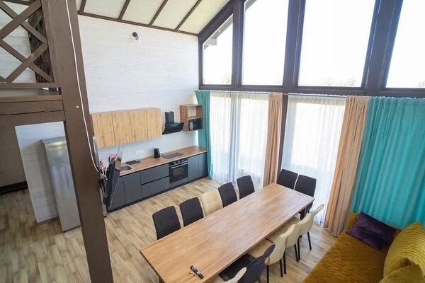 Размещение предусмотрено в уютном двухэтажном гостиничном корпусе или в уединенных гостевых домах, выполненных в стиле альпийского шале. Номера оборудованы всем необходимым: индивидуальным санузлом с душем, феном и косметическими принадлежностями, удобной мебелью, телевизором и Wi-Fi; в некоторых есть чайник и холодильник. Домики на горе оснащены кухней, гостиной, обеденной зоной, а также собственными террасами и мангальными зонами.